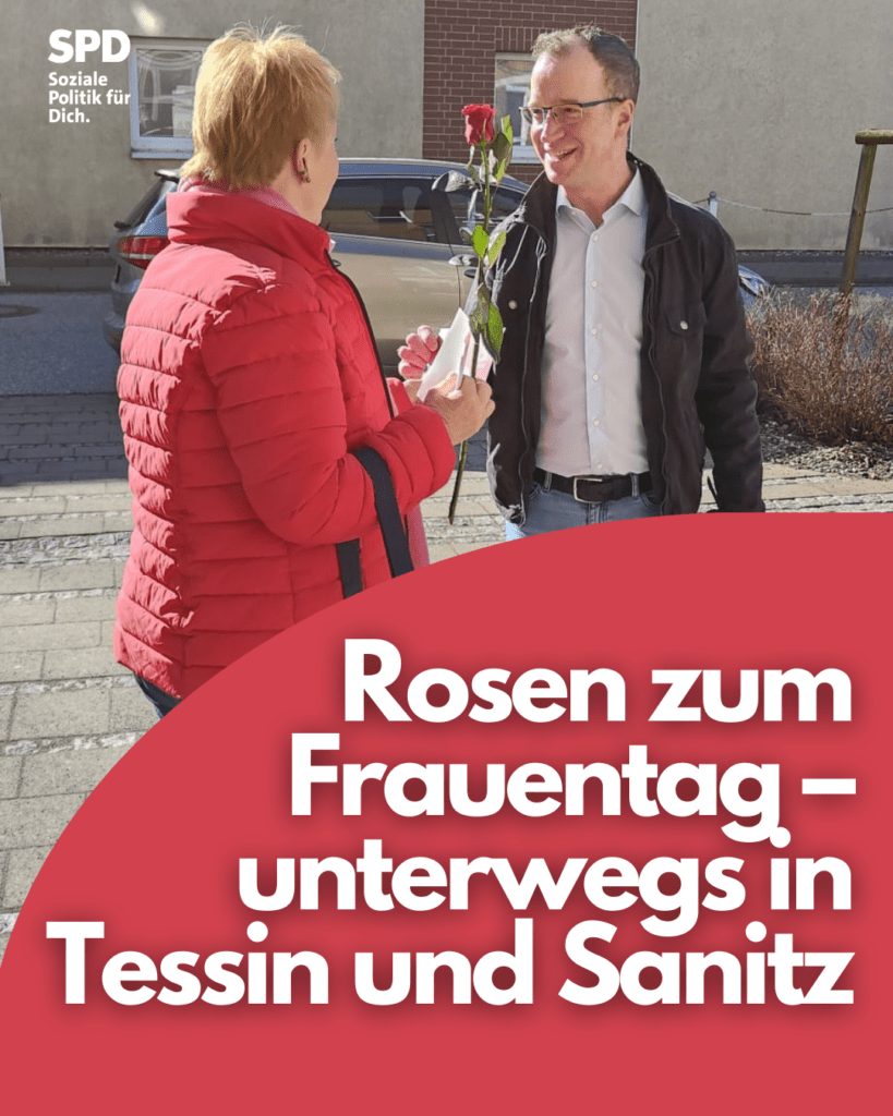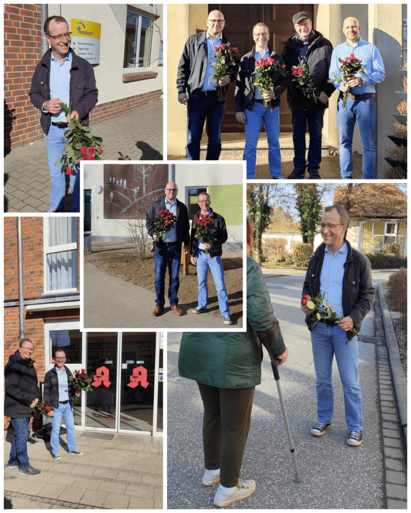 Auch heute waren wir wieder unterwegs, um anlässlich des bevorstehenden Frauentags Rosen zu verteilen – diesmal in der Blumenstadt Tessin und Sanitz. Dabei haben wir vor allem Frauen getroffen, die tagtäglich Großartiges leisten: